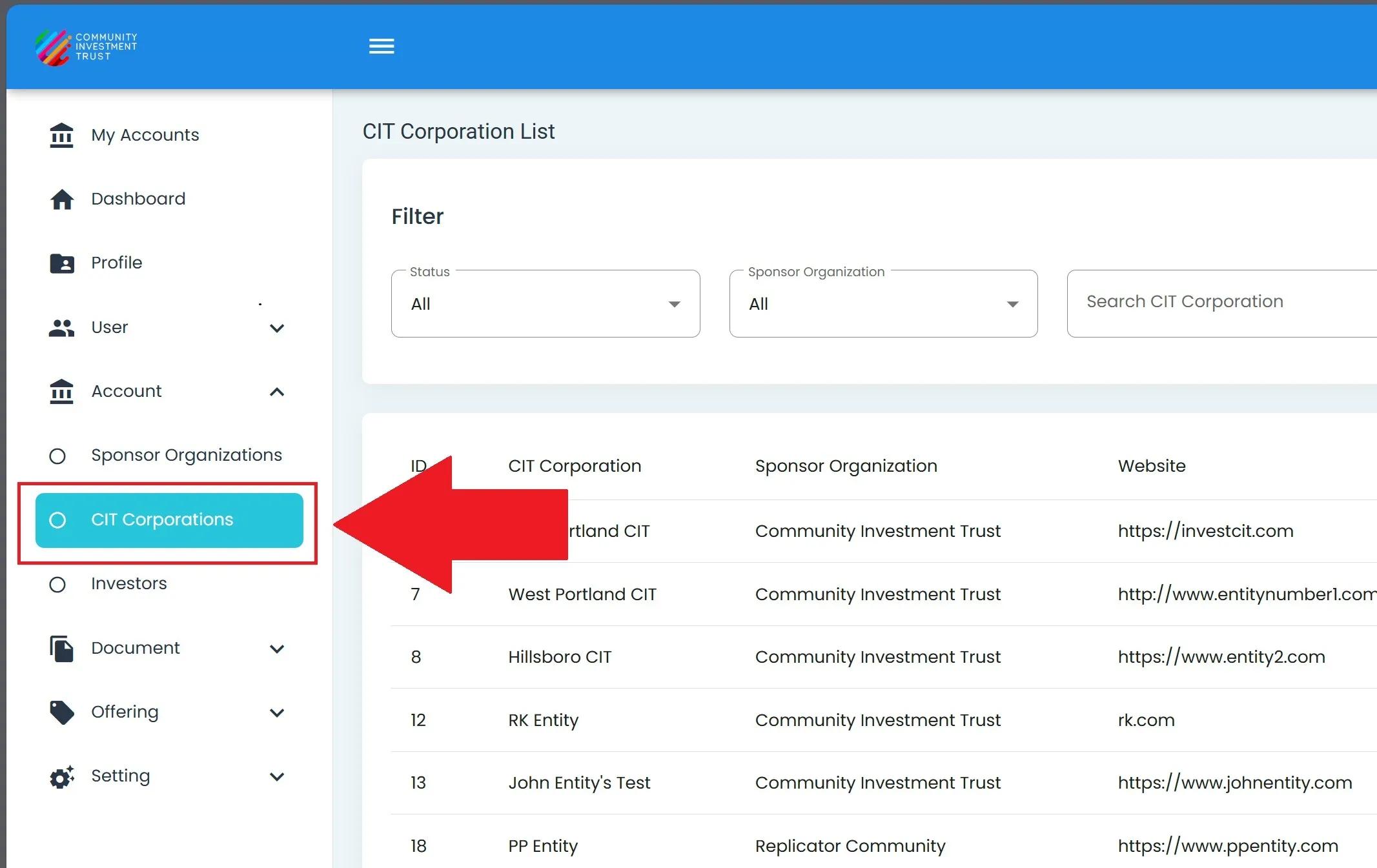 The Section: CIT Corporations section opens up to Table: CIT Corporations List table: