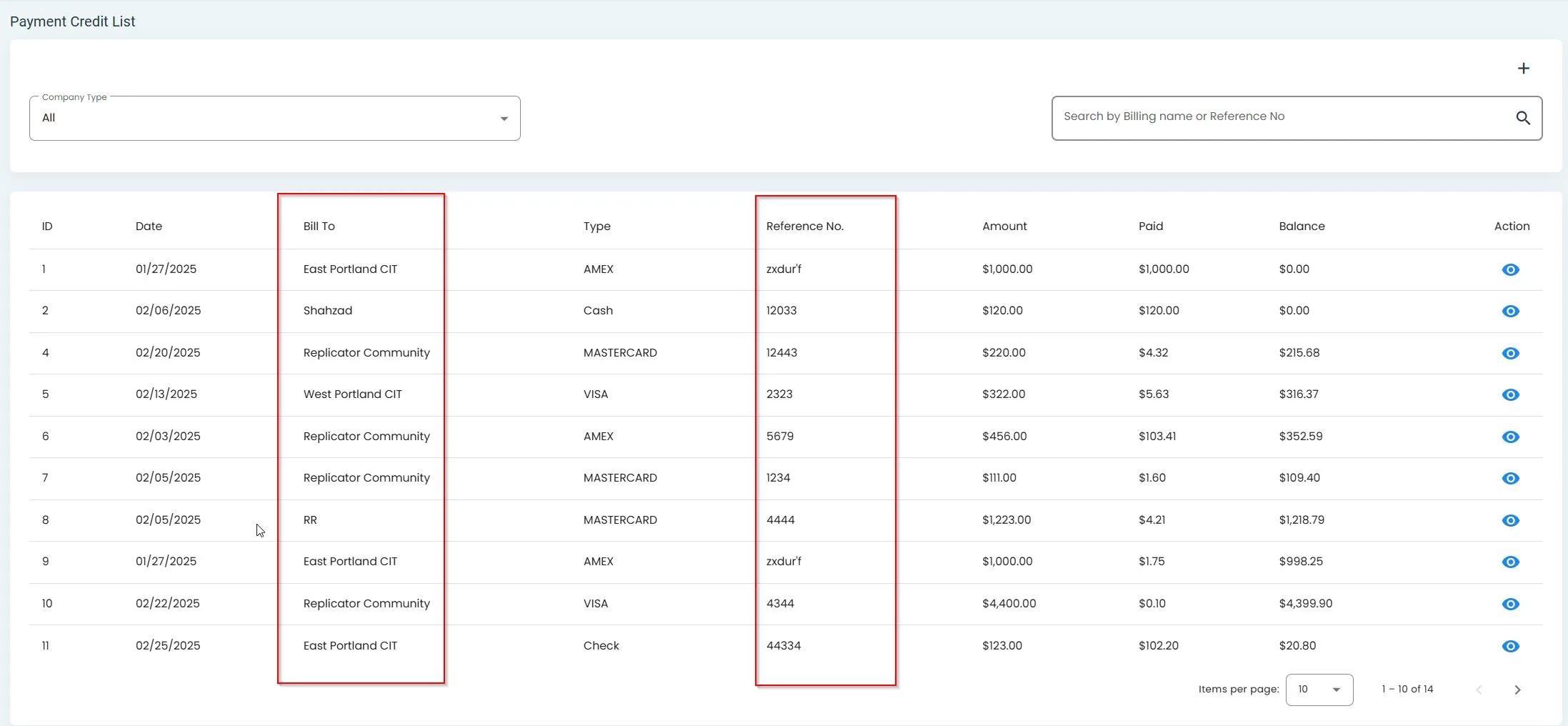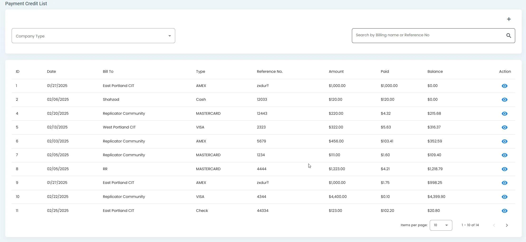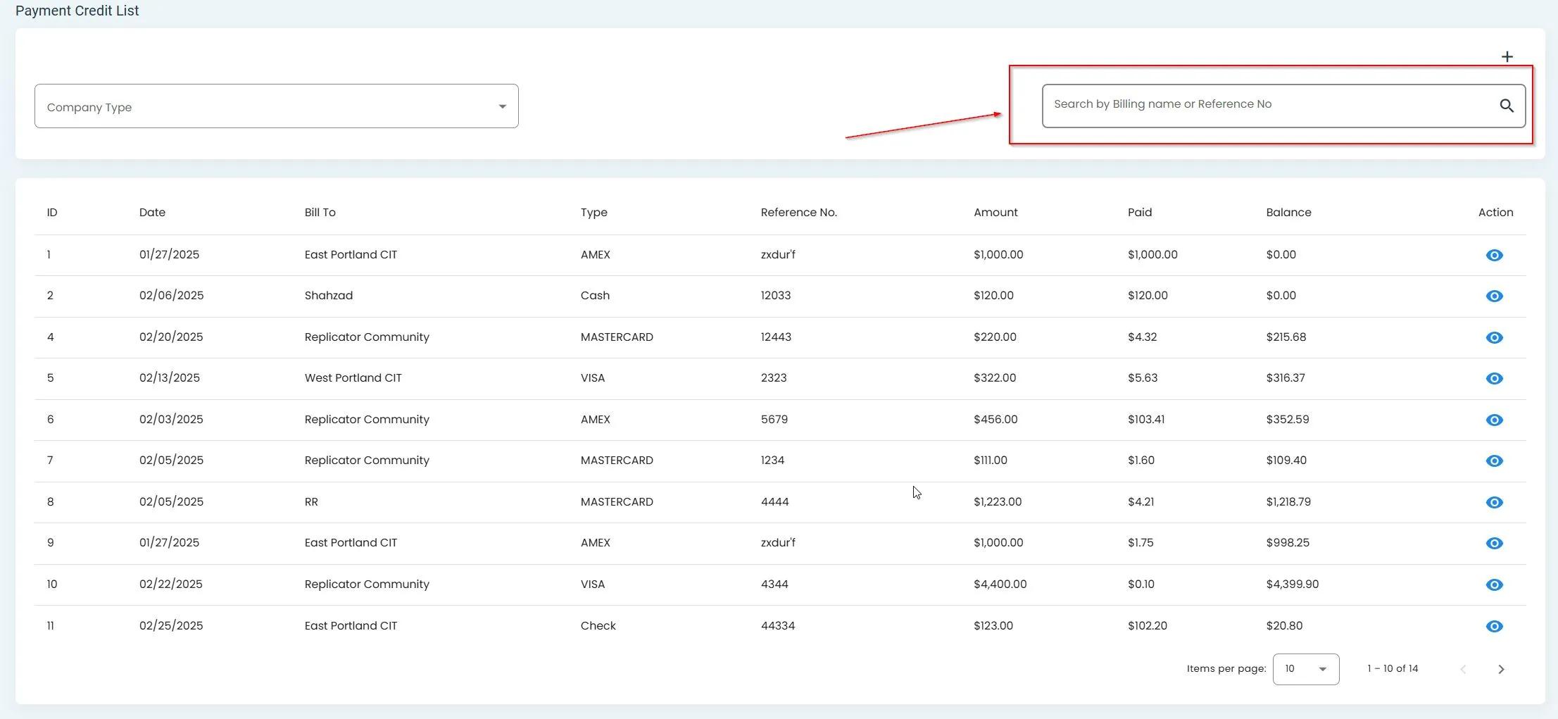 You can search for specific payment records using the search functionality.
