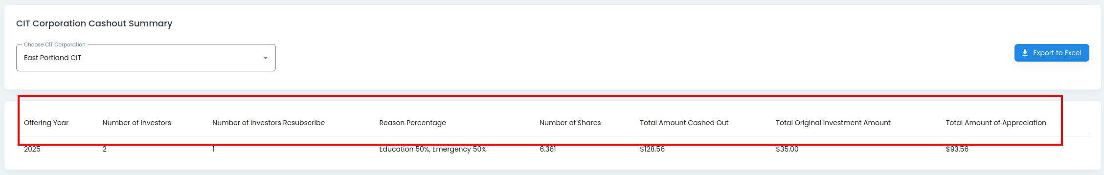 Dashboard, CIT Corporation Cashout Table Columns Explained#