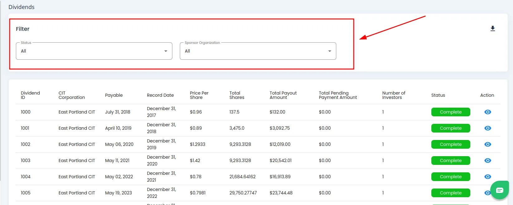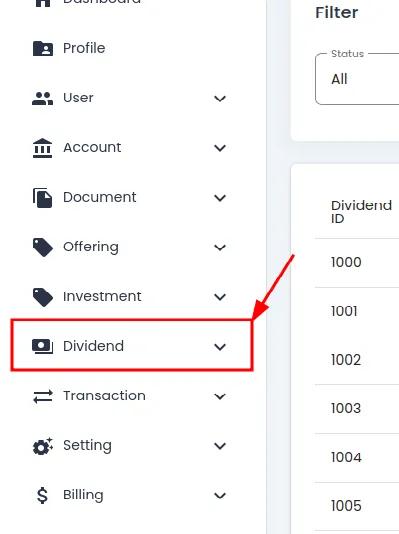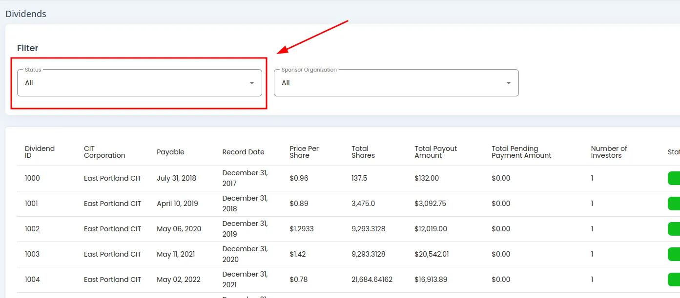 Dividends Table Filter Section Highlighted#