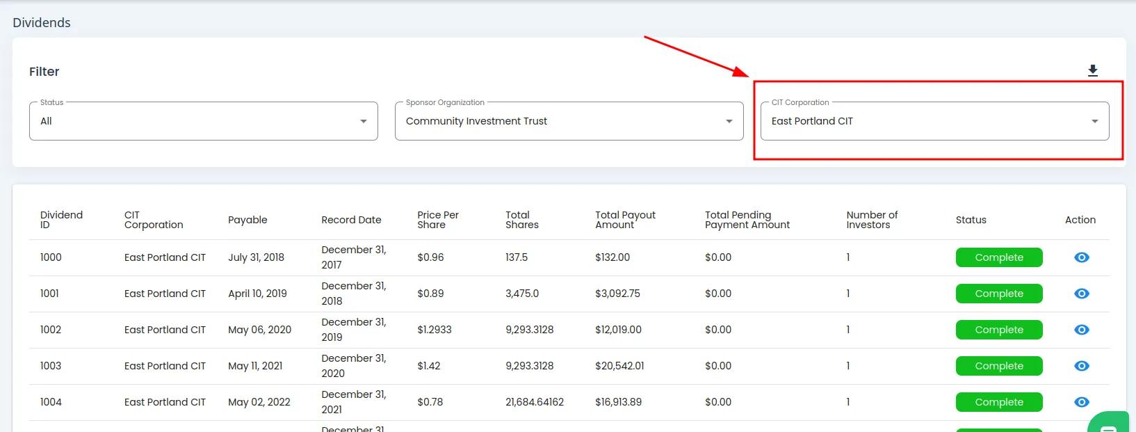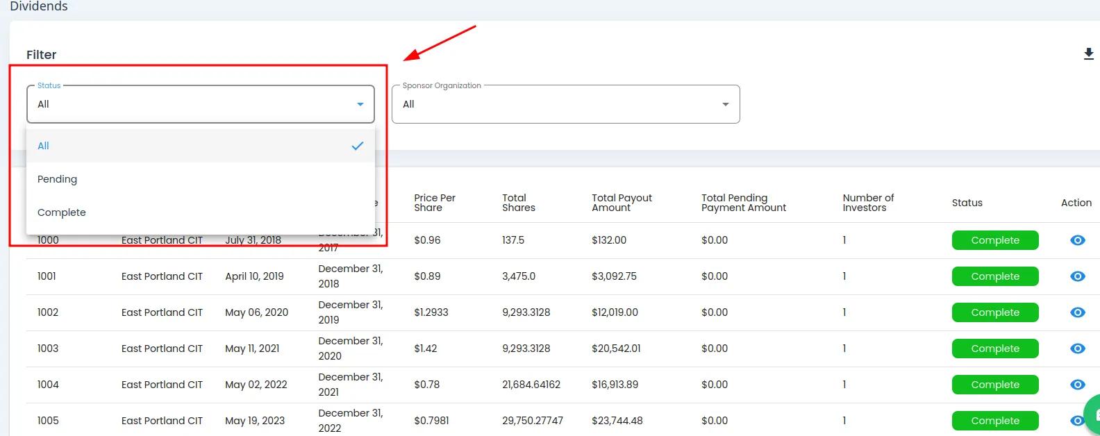 Column: Status: The current status of the dividend (e.g., Complete)