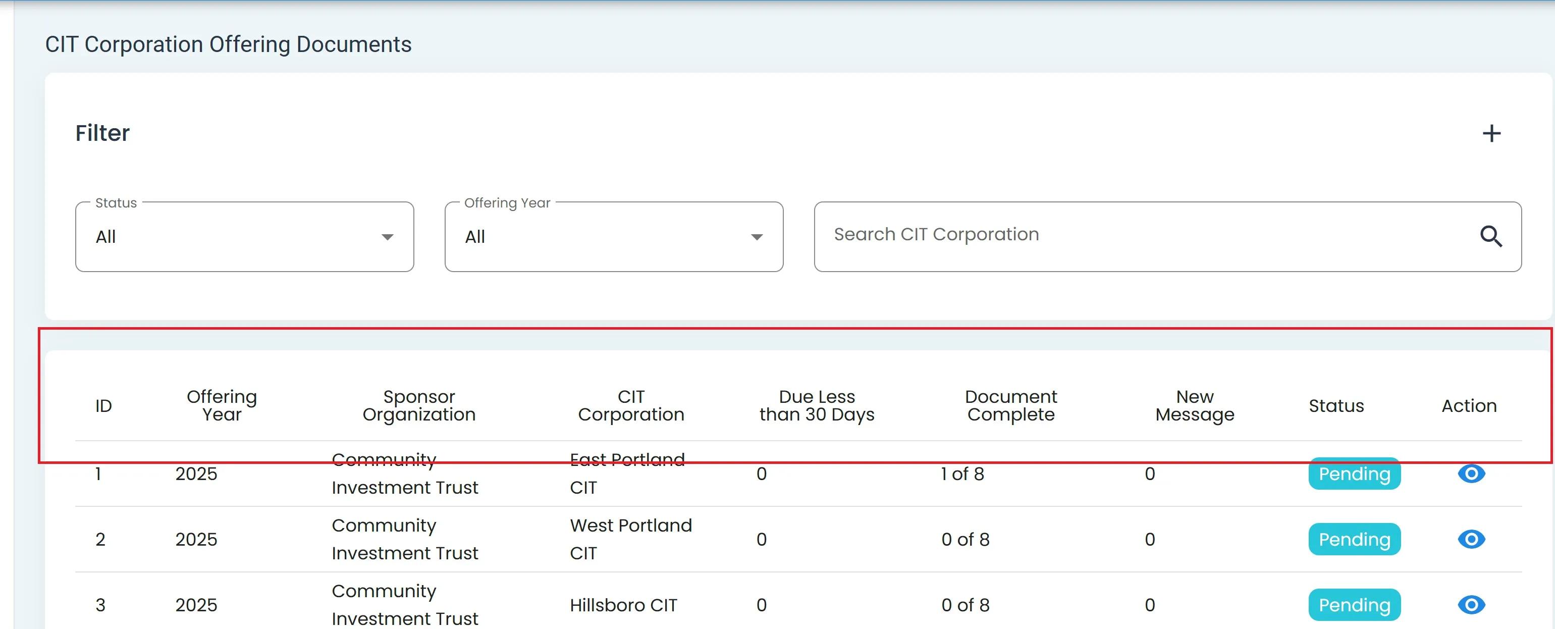 Action: View More Details: Action to view more details about the documents and where they are at on the offering process for the selected CIT Corporation.