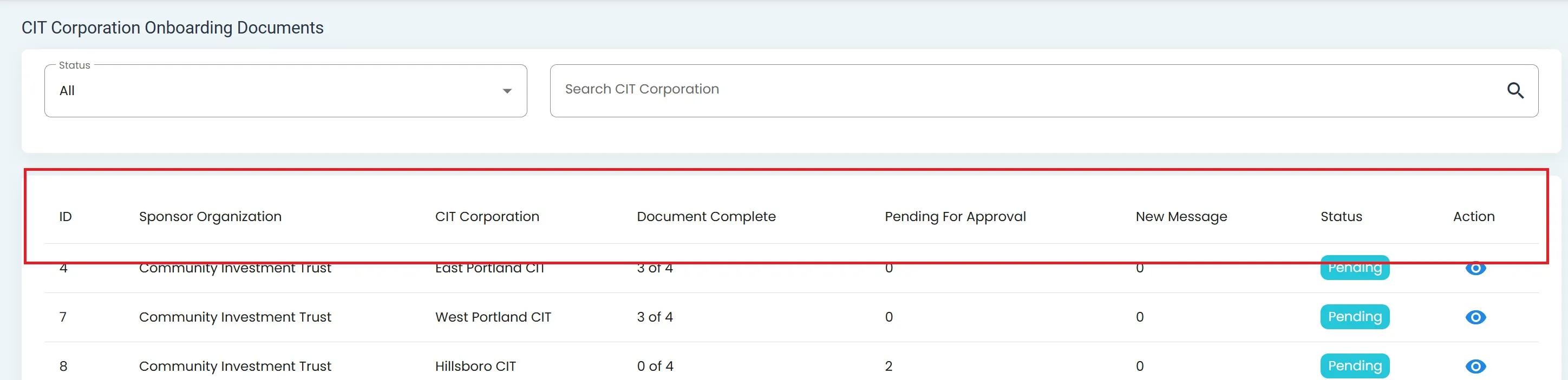 View More Details`: Action to view more details about the documents and where they are at on the onboarding process for the selected CIT Corporation.