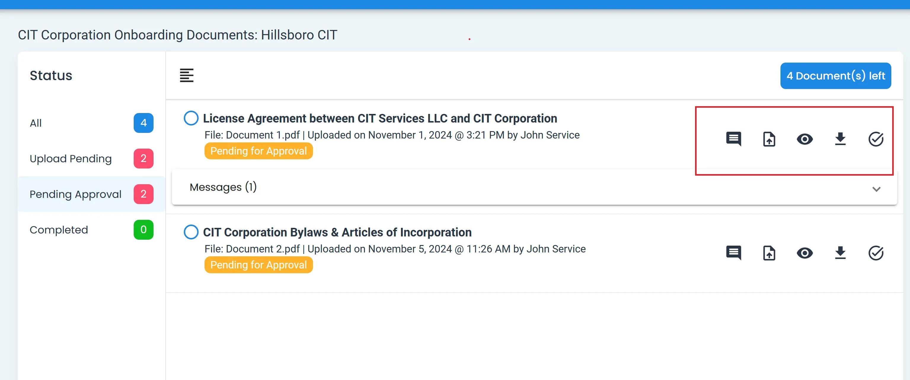 Pending Approval Tab: Available Actions# The Pending Approval cards contain Available Actions as can be seen: