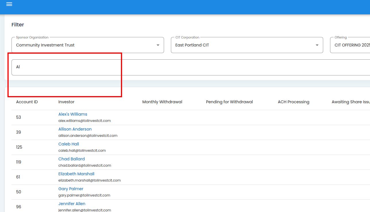 This section covers how search for Investors in the Table: Enrollments table works and what the options are.