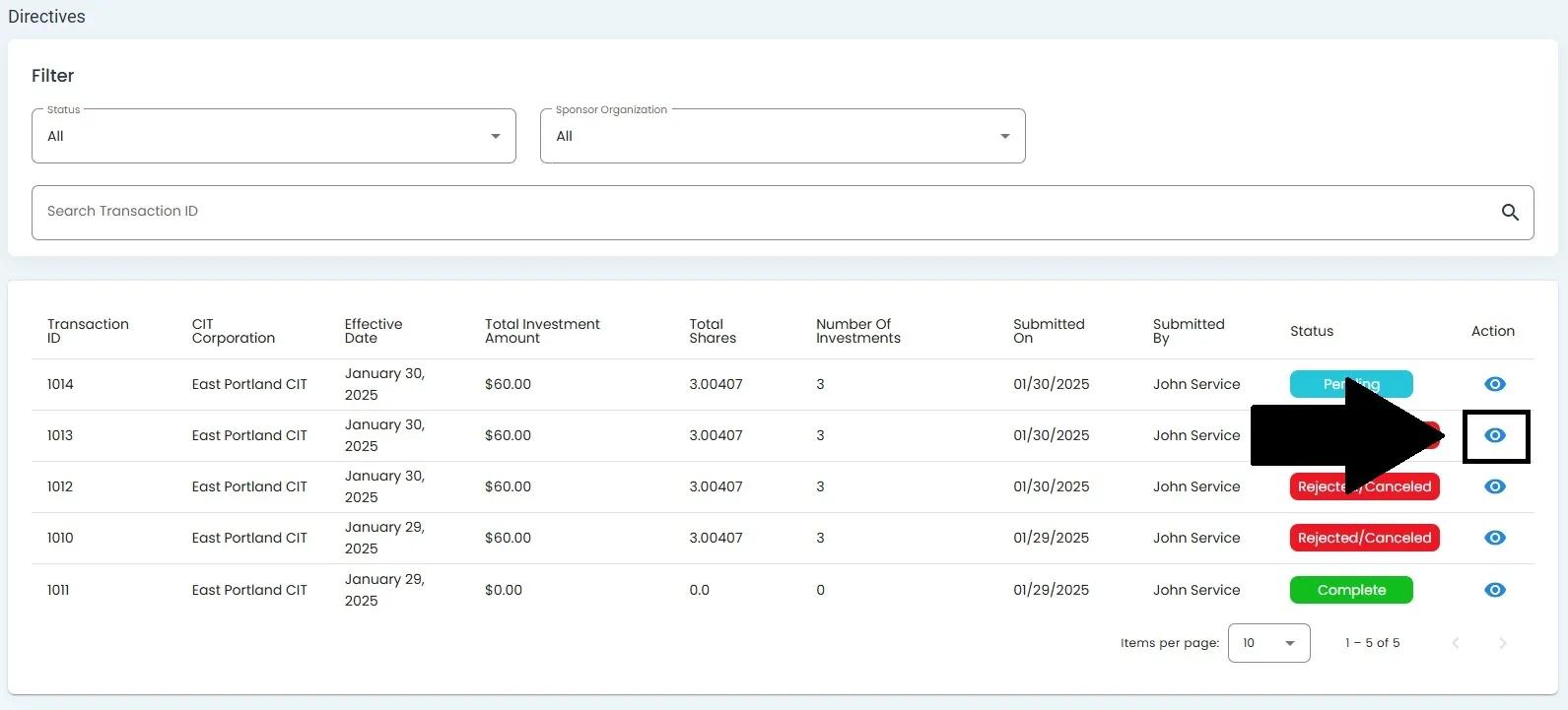 Directive Details Screen showing comprehensive information about Transaction ID 1014 including Info and Investments sections#